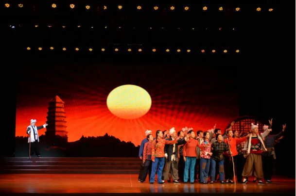 歌舞劇《南泥灣》以陜北青年腰鼓、窗花為男女主人公,通過安塞腰鼓、陜北說書、陜北民歌等典型黃土風(fēng)情文化元素,展示陜北元素,講述紅色故事,全方位、多角度地展現(xiàn)了上世紀(jì)4 0 年代初發(fā)生在南泥灣轟轟烈烈的大生產(chǎn)運(yùn)動以及在大生產(chǎn)運(yùn)動中產(chǎn)生的“自力更生、艱苦奮斗”的南泥灣精神,傳頌勞模精神、禮贊工匠精神、弘揚(yáng)延安精神。
