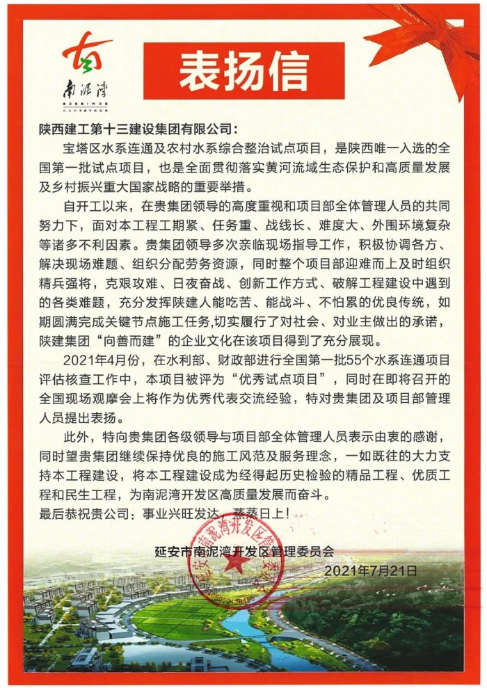 近日,陜建十三建集團收到了來自南泥灣開發區管委會的表揚信。信中,對集團寶塔區水系連通及農村水系綜合整治試點項目全體管理人員表示了高度贊揚。