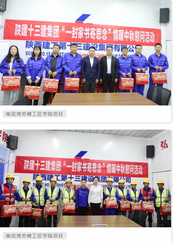 在中秋佳節來臨之際,9月16日至17日,陜建十三建集團黨委、工會分別赴金鴻·行知坊項目、伴山樾谷·芳菲里項目、南泥灣勞模工匠學院項目施工一線慰問項目管理人員和廣大農民工朋友,并為他們送去了月餅及節日的祝福。